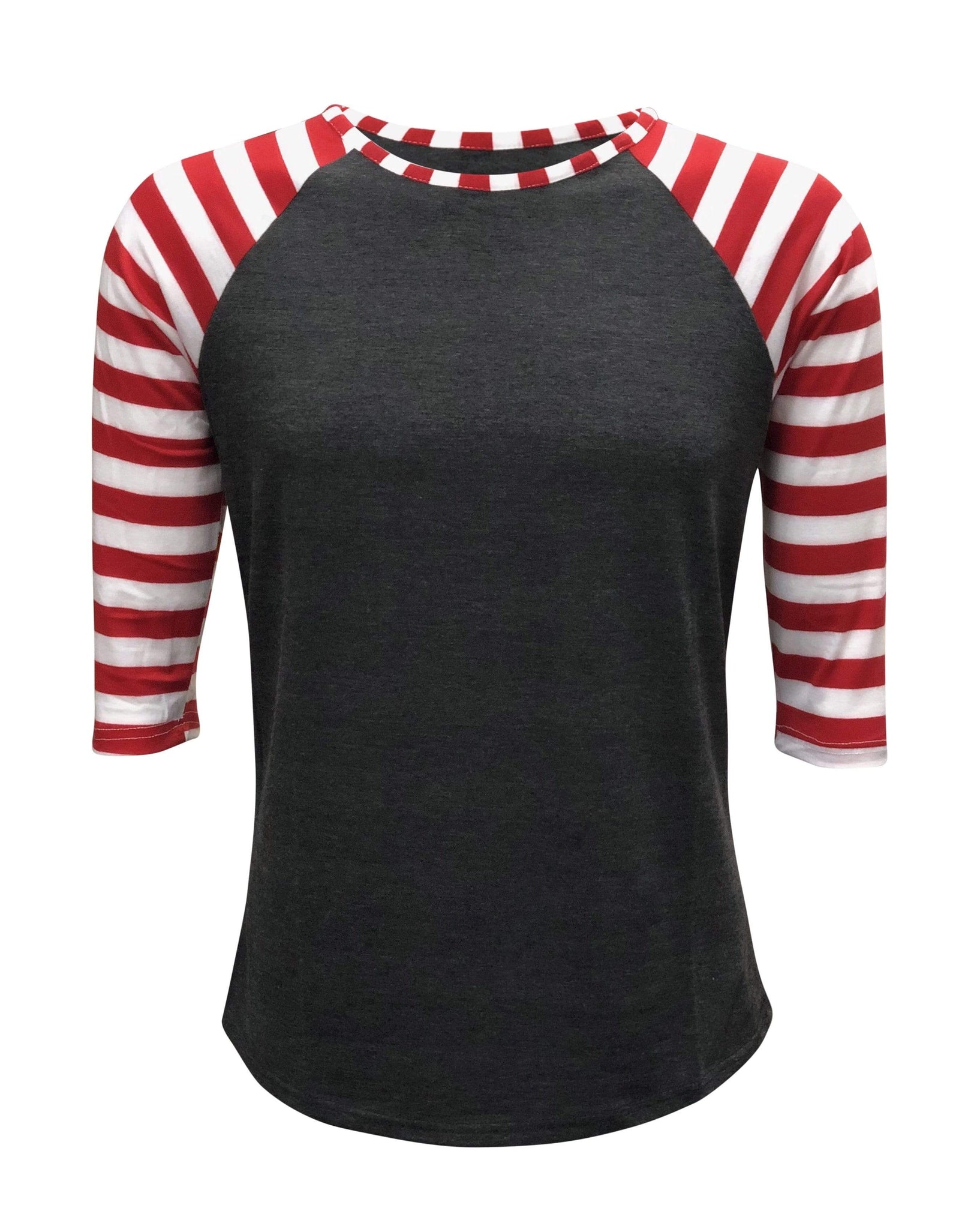 * Charcoal Body with Red Candy Cane Striped Sleeve * 3/4 Sleeves Length * Material: 95% Polyester 5% Spandex * Great for sublimation, vinyl, embroidery customization * Extremely soft material * Unisex Adult Sizes: Small - 3XL (These are true to size)