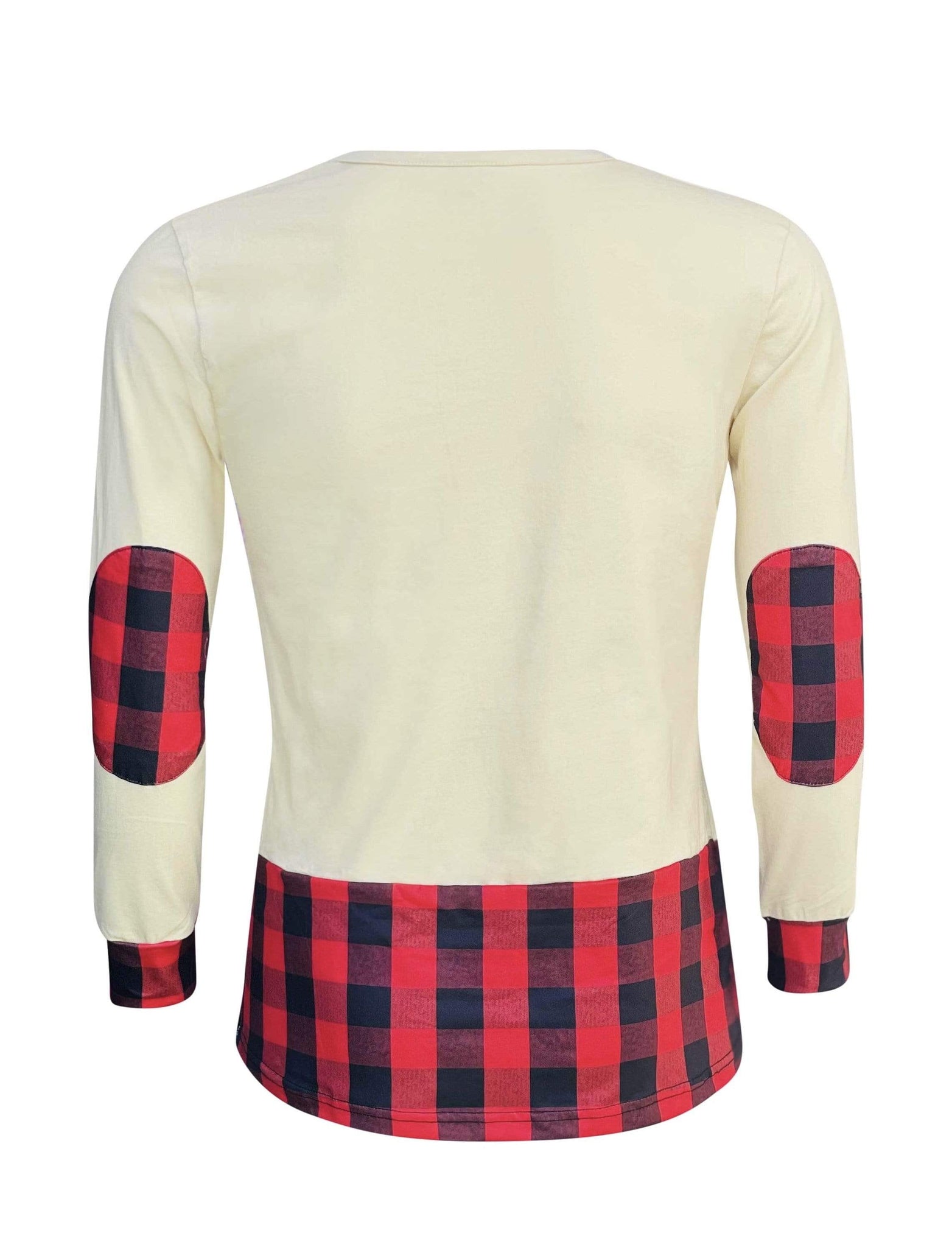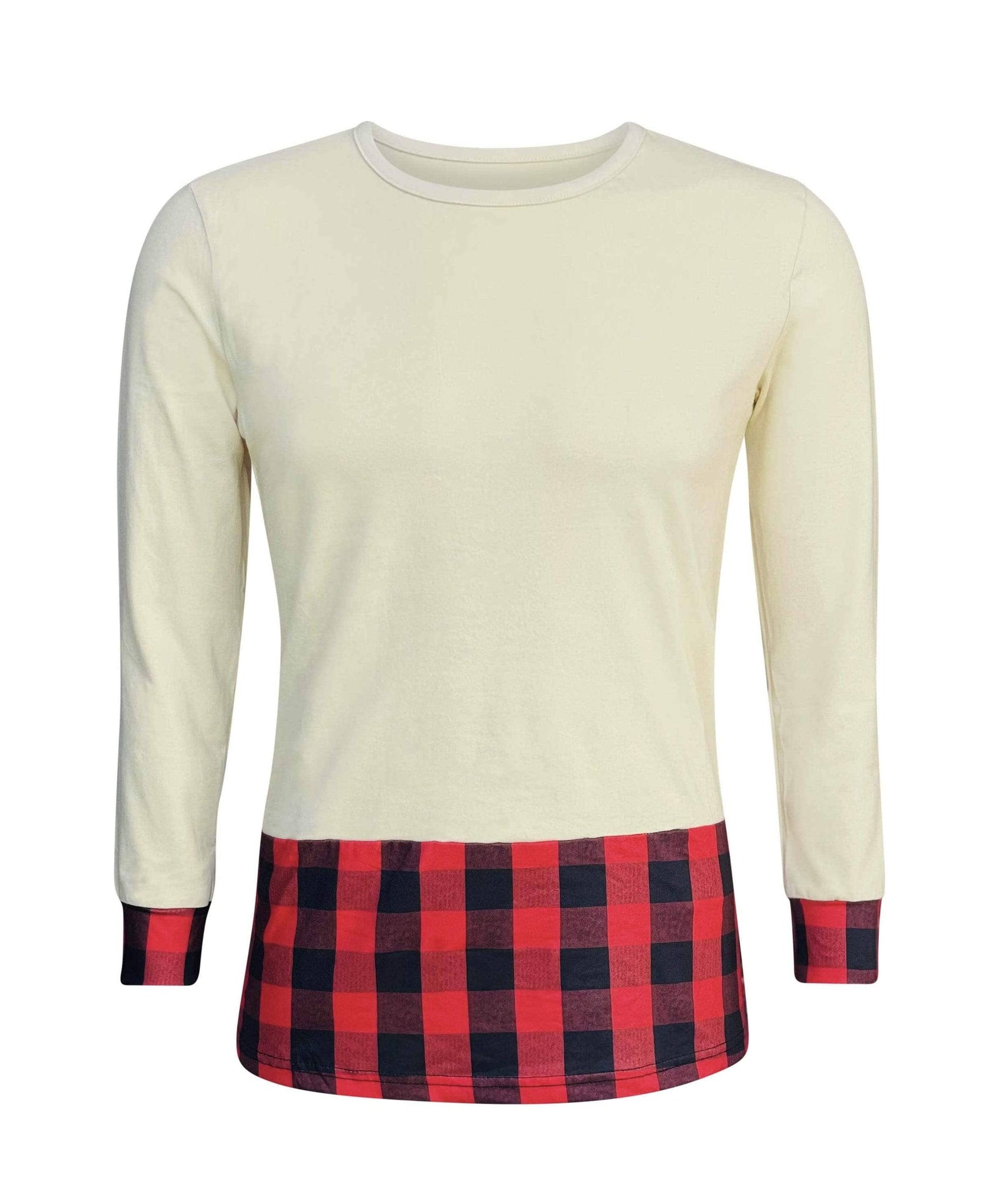 Price includes transfer. * Color Block Top Beige Red Plaid Top * Material: Top - Cotton, Bottom - Polyester * Adult Sizes: Small - 3XL * Long Sleeves Top * Red Plaid Cuffs and Elbow Patches * Very soft and comfortable fit and runs true to size * Great for Christmas!