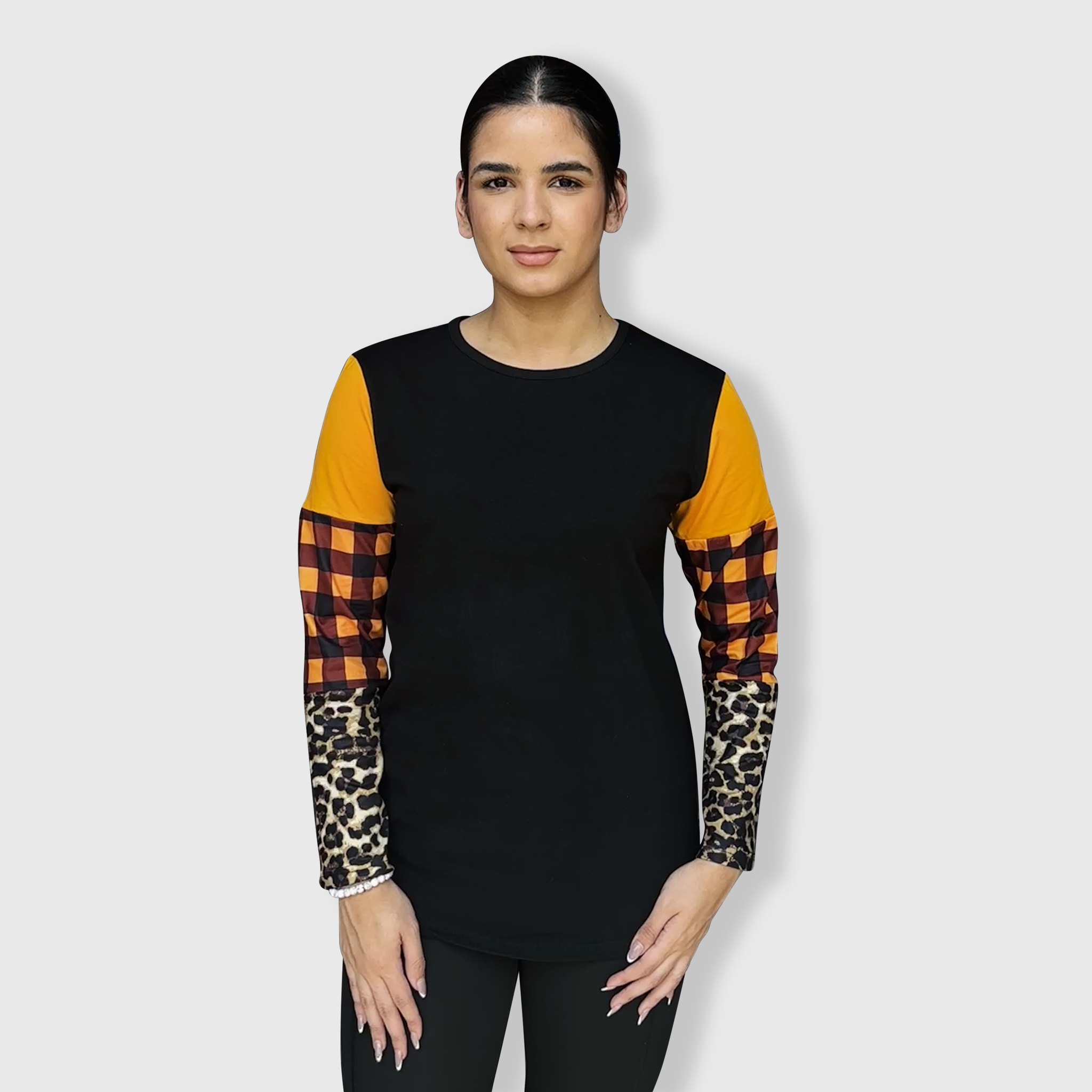 * Black Body with Orange Plaid Cheetah Sleeves * Customizable, add your own designs to the middle! * Material: 95% Cotton 5% Spandex * Long Sleeve Style * Two tone shirt with contrast sleeves * Machine wash warm, tumble dry low * Great for Fall and Halloween!