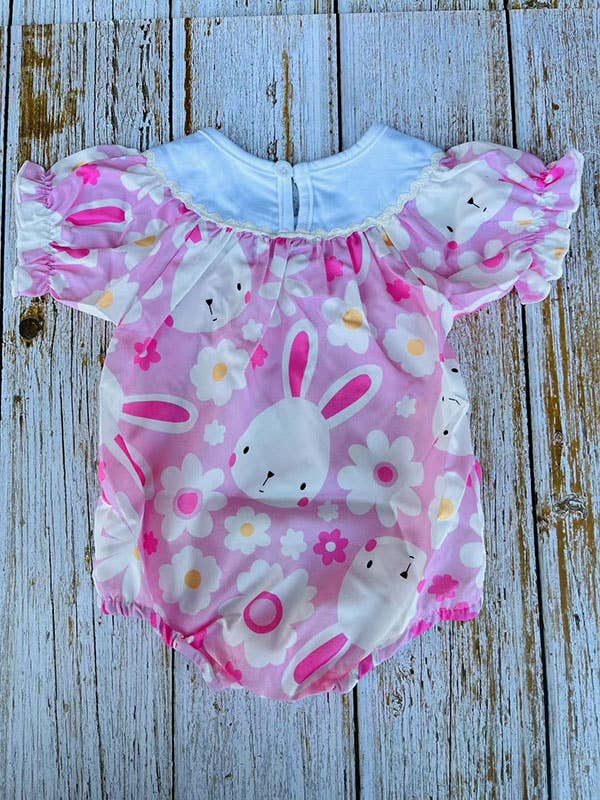 Hop into Easter fun with this adorable baby onesie featuring charming egg and bunny embroidery paired with a sweet bunny print. Designed for comfort, the romper boasts ruffled short sleeves and convenient snap buttons for easy diaper changes. Crafted from soft, breathable 100% polyester, this piece keeps your little one cozy without restriction. Perfect for holiday photos, celebrations, or everyday wear during the season. One onesie included.