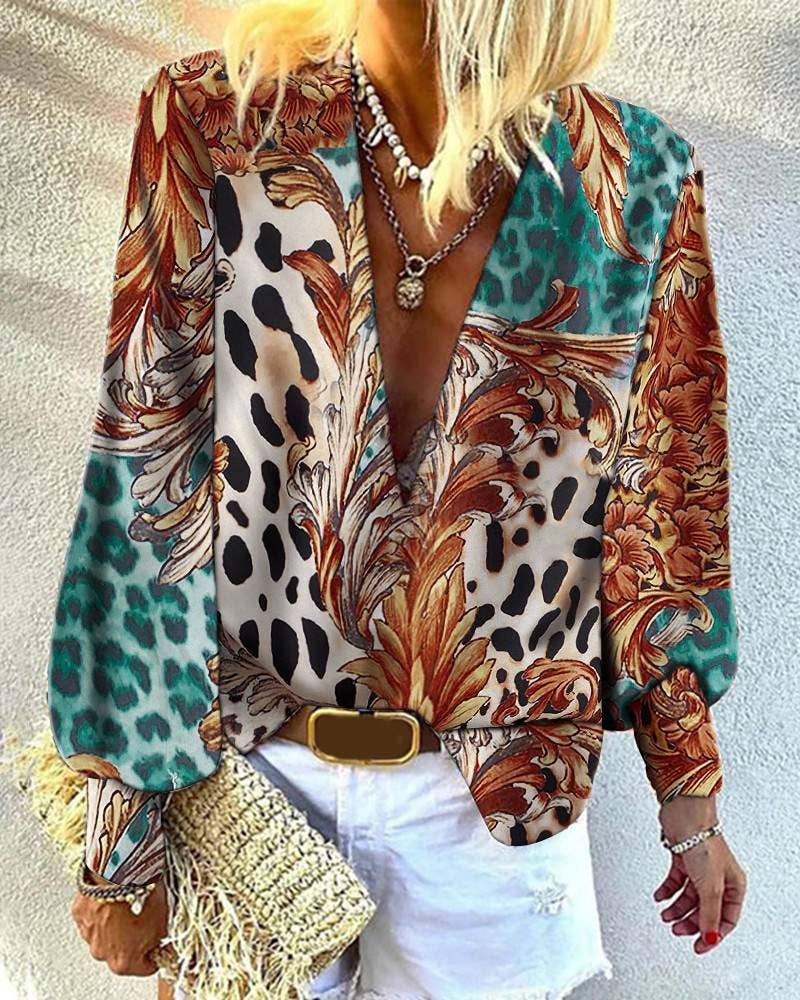 floral print deepv lantern sleeve shirt style: chic type: shirt material: polyester neckline: deep v neck sleeve style: long sleeve length: regular pattern type: floral decoration: cutout fit type: regular occasion: daily