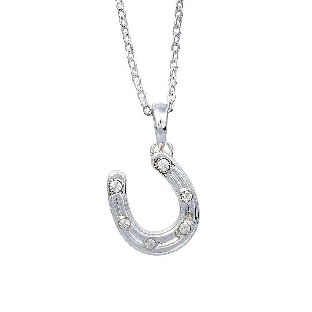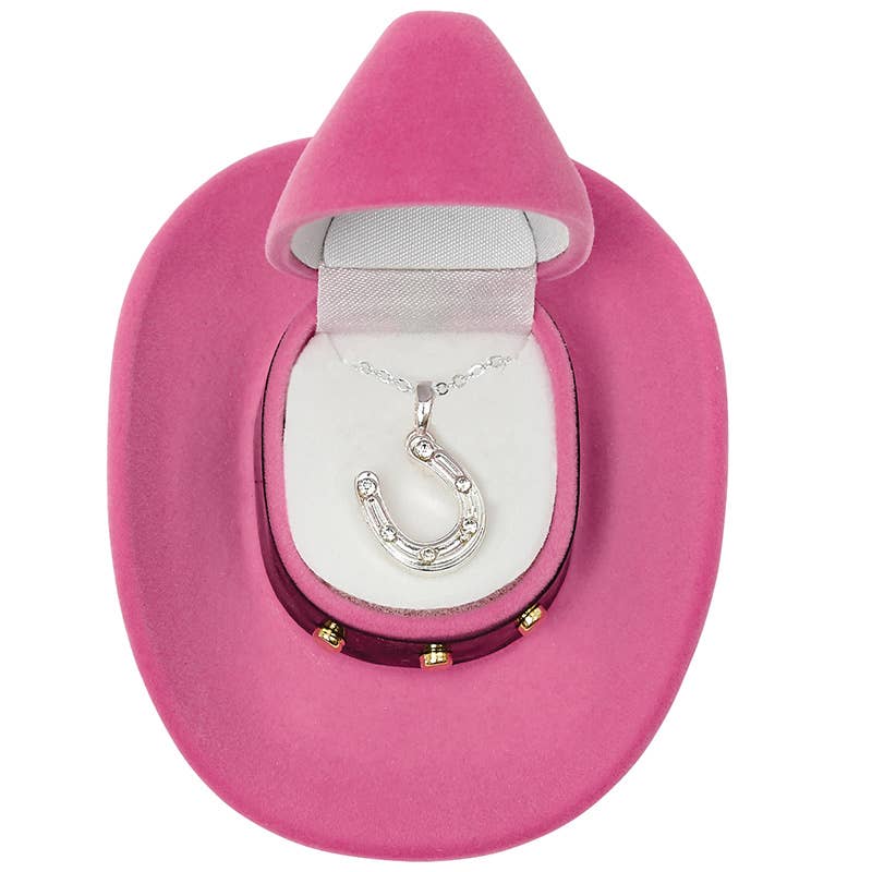Horseshoe necklace with clear European crystals is packaged in a velour cowboy hat gift box (box color may vary).
