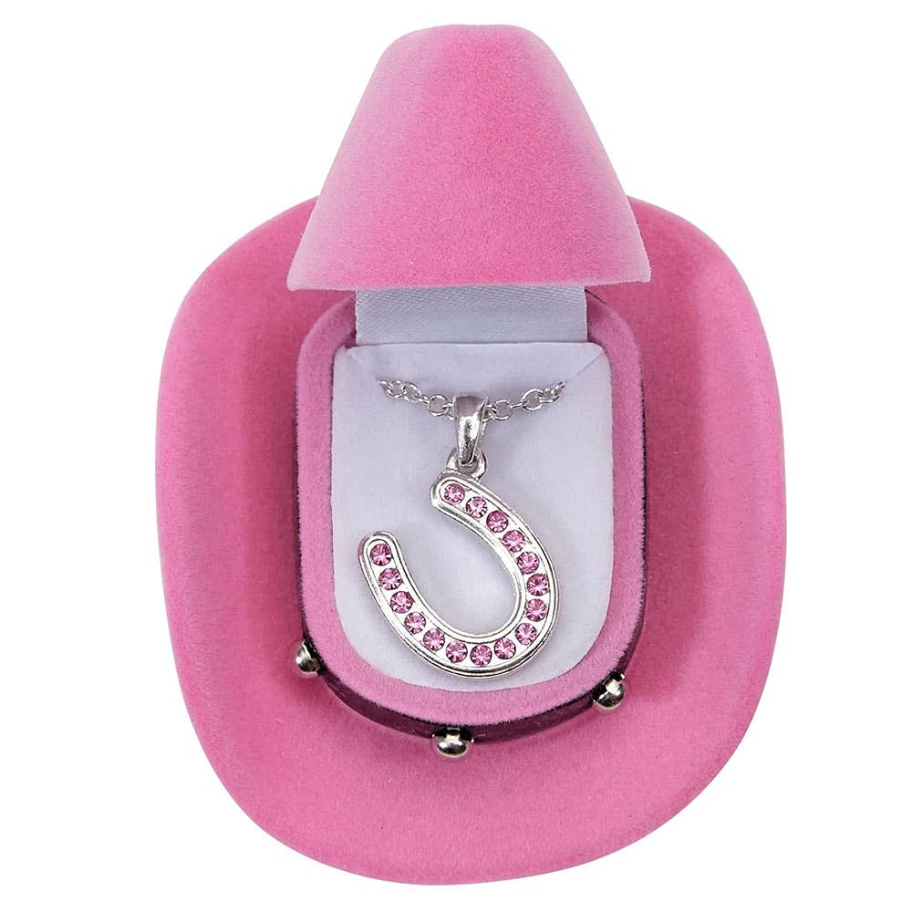 Horseshoe necklace with pink rhinestones is packaged in a velour cowboy hat gift box (box color may vary).