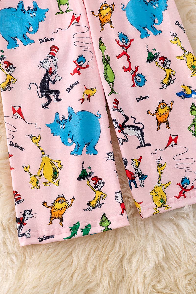 This elegant 2-piece set features a dr. Seuss printed design, made from 95% polyester and 5% spandex. The set includes a pink ruffle top and wide legged pants. Perfect for making a statement while staying comfortable.