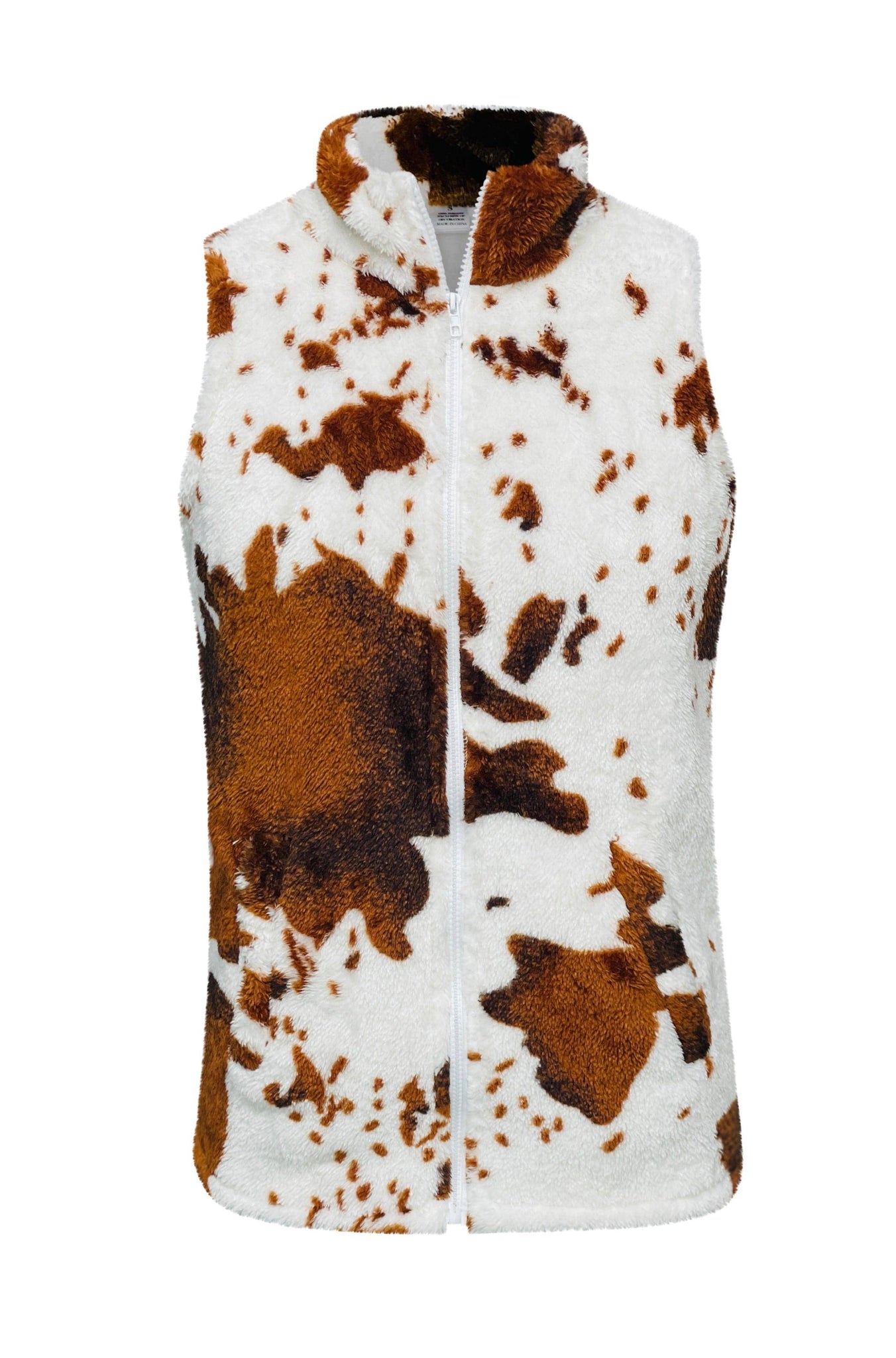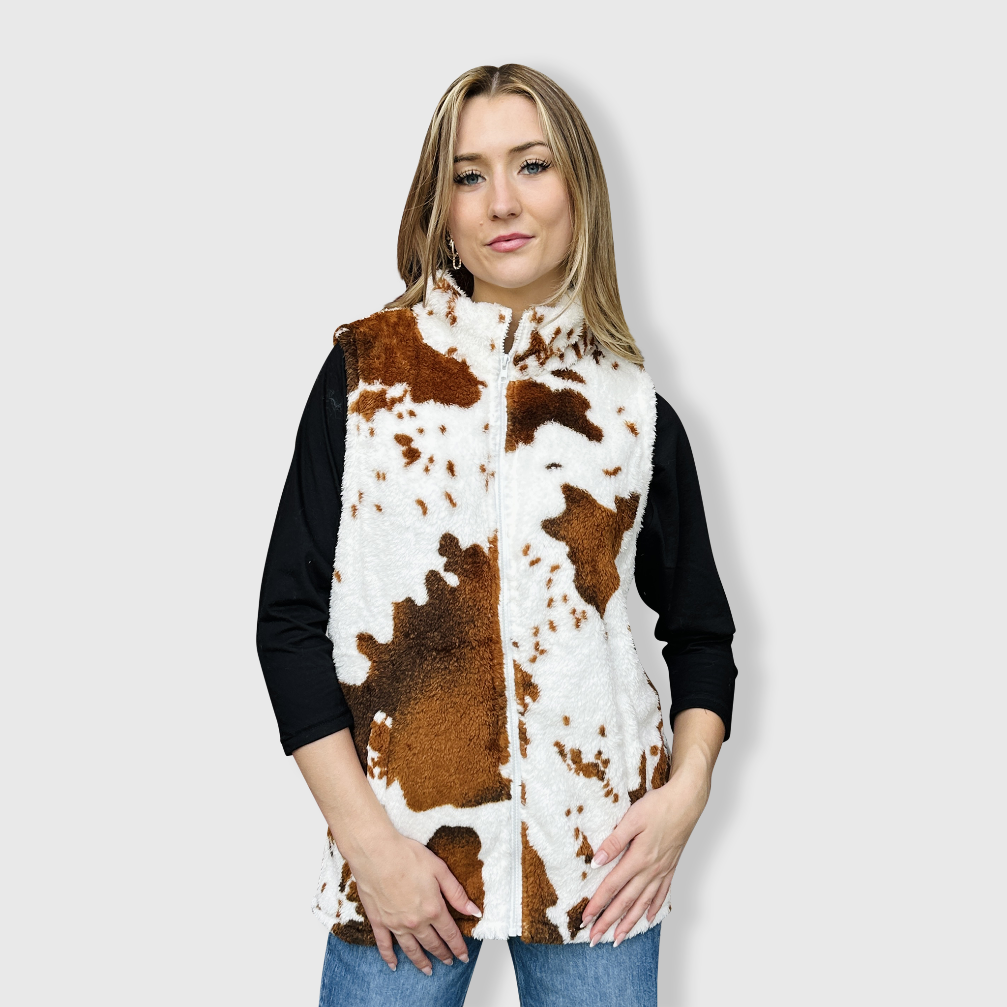 * Cow Brown Print Vest Women * Material: Sherpa Material * Adult Sizes: Small - 3X-Large * Extremely lightweight and comfortable * Full Zip Closure * Pockets * Stay warm and shine bright with this soft sherpa vest