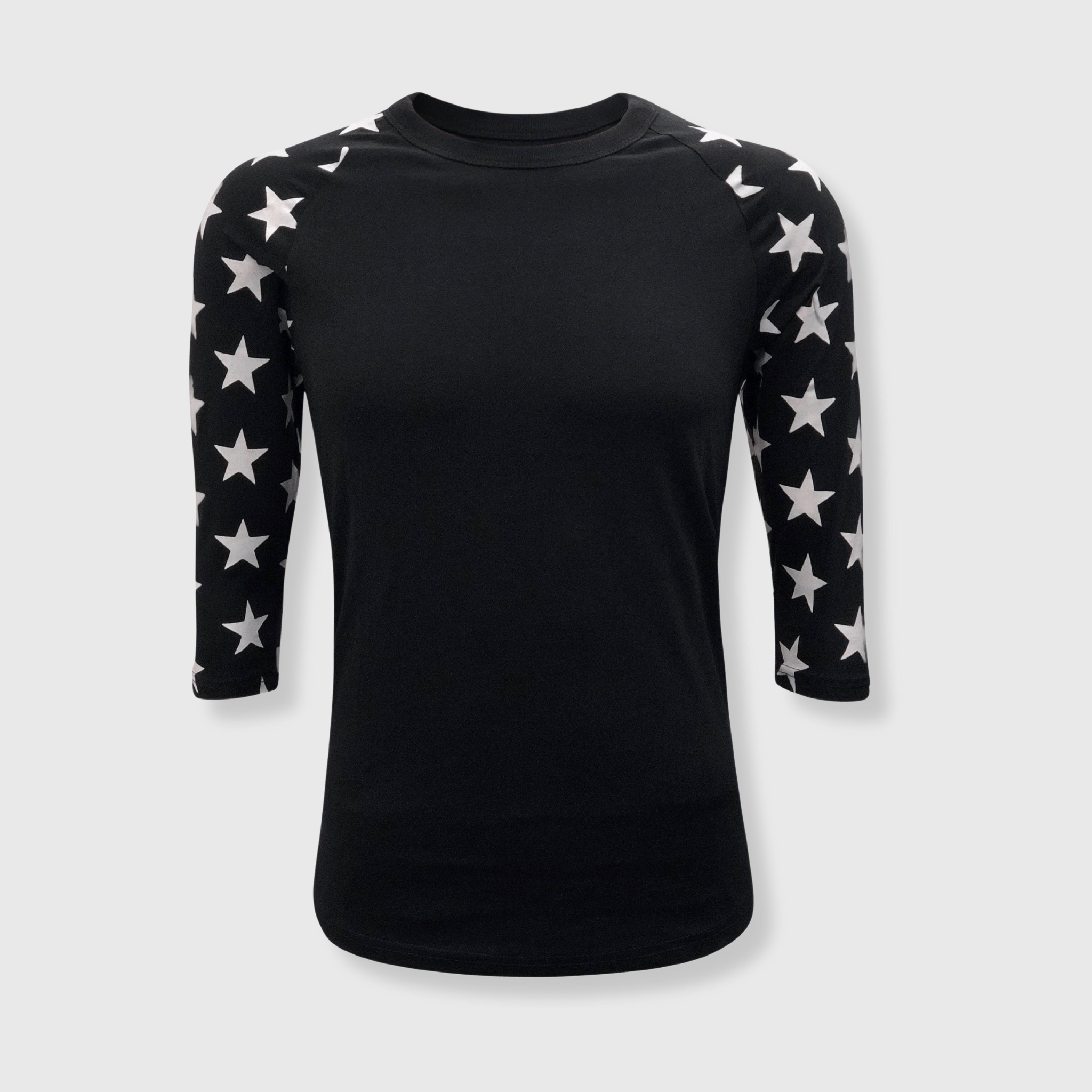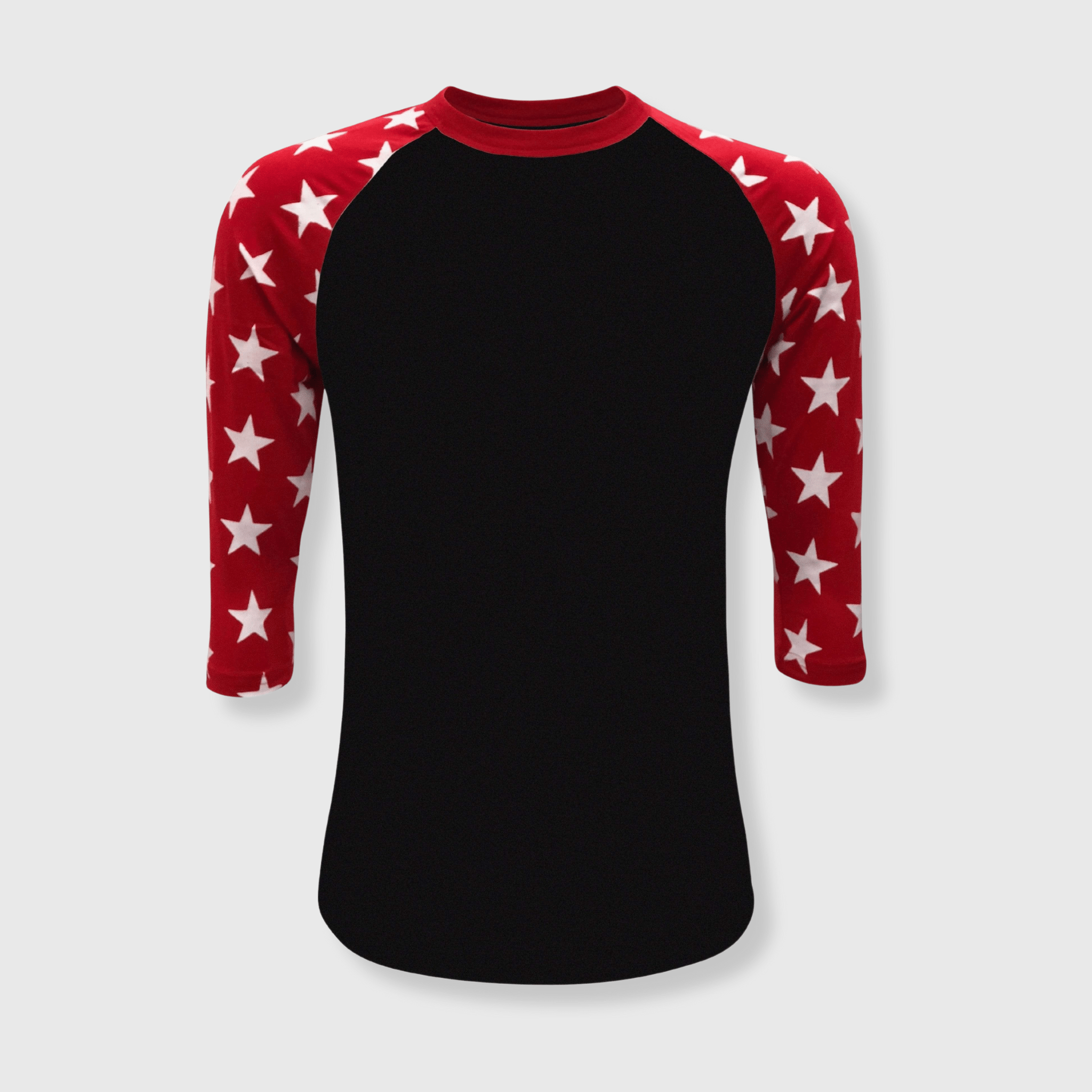 * 60% Cotton 40% Polyester * 3/4 sleeves with screen printed stars * Classic Fit, unisex * Crew neck design * Youth Sizes YSmall - YXLarge