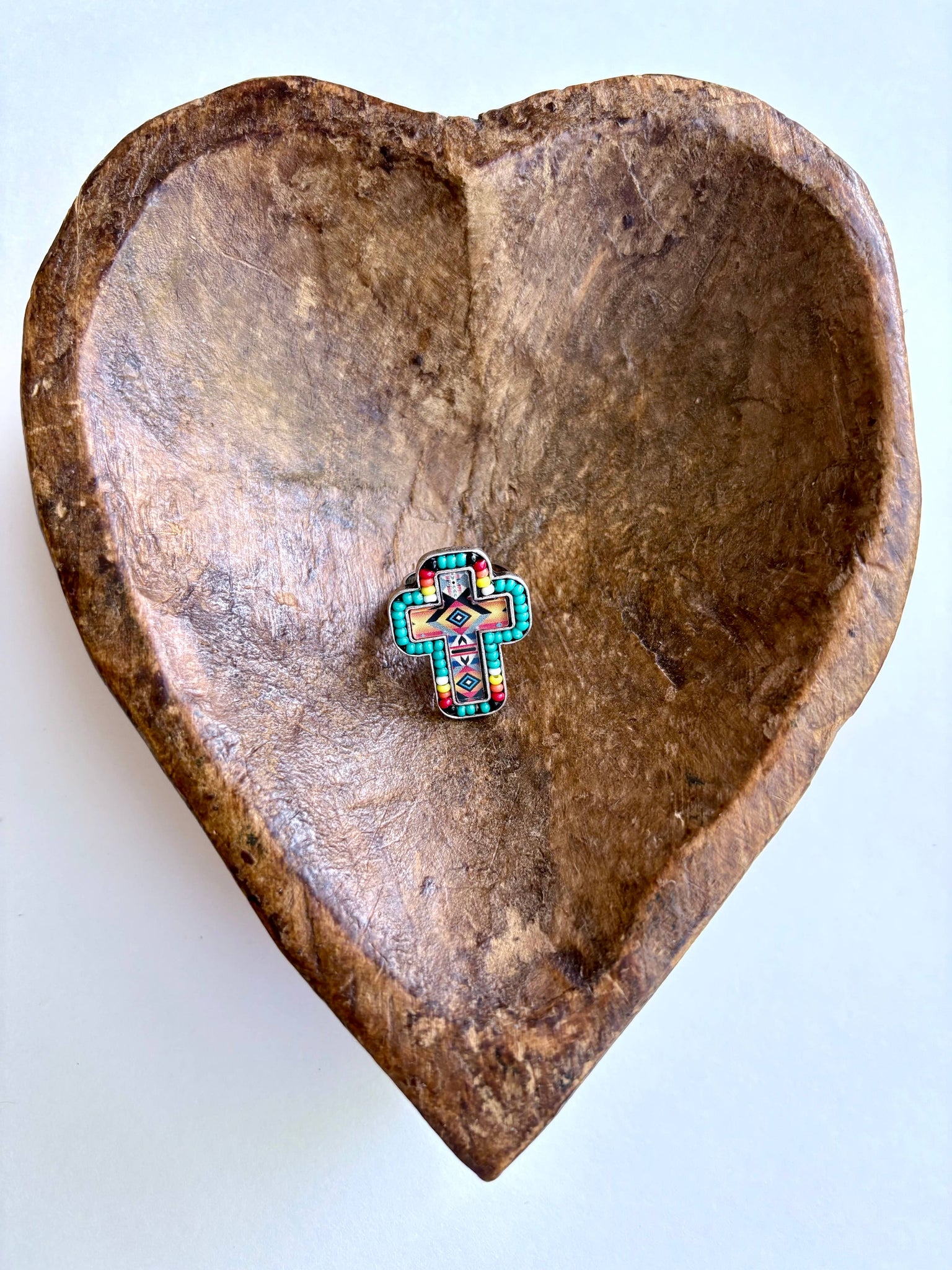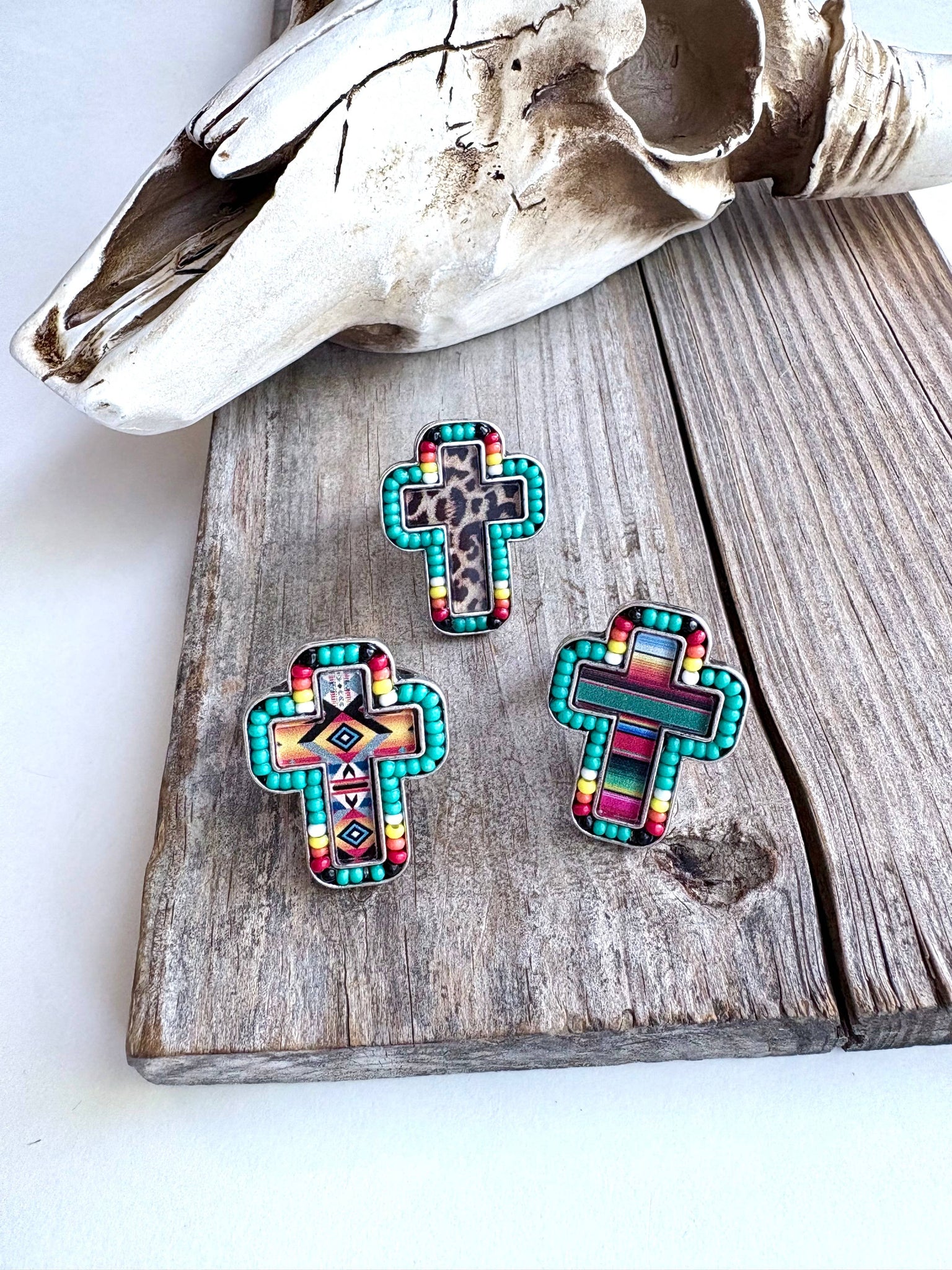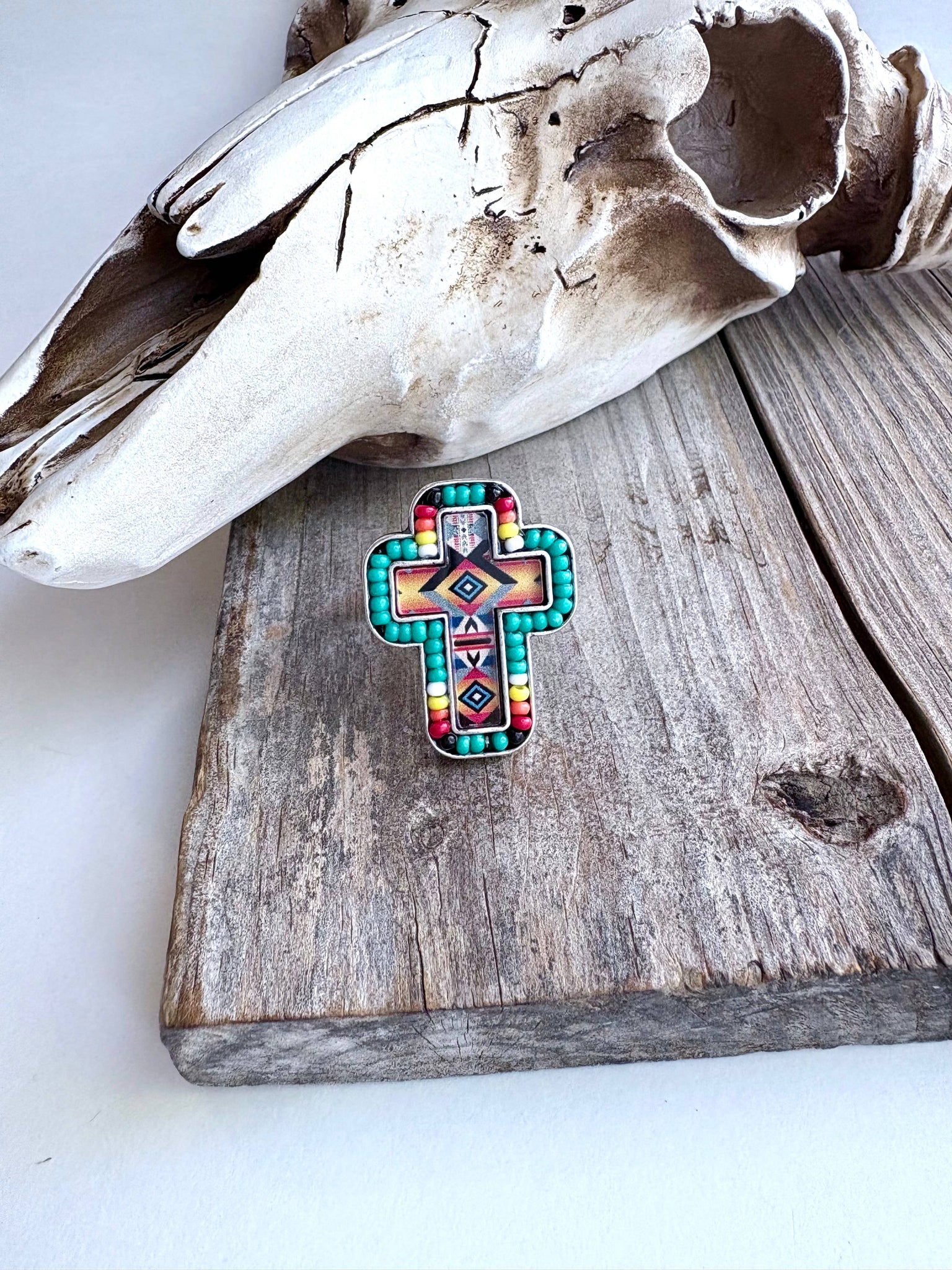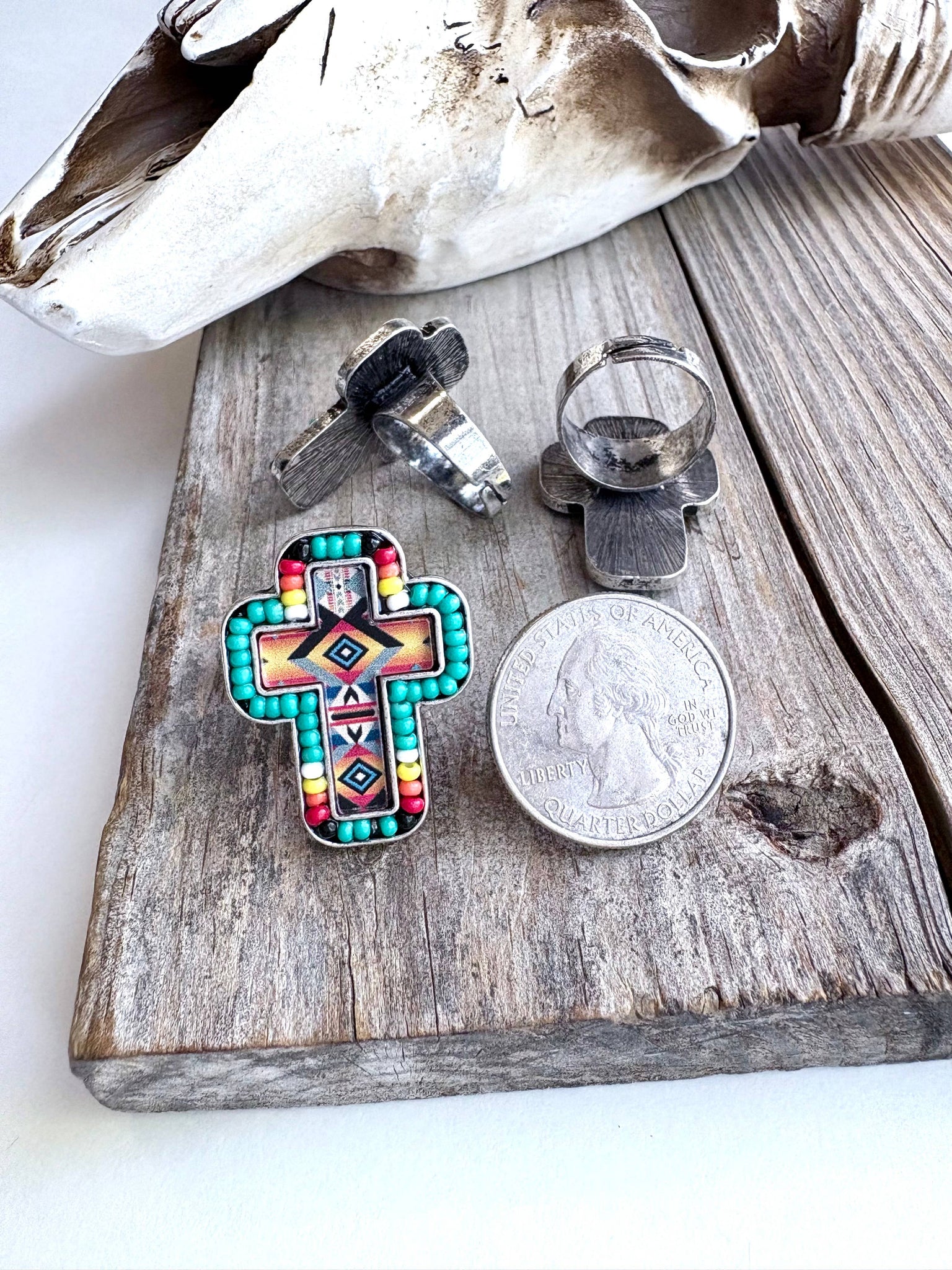 Western Printed Seed Bead Cross Adjustable Ring Size: Adjustable Cactus: 1.25"L Brushed Silver, Seed Bead, Acrylic Lead Compliant