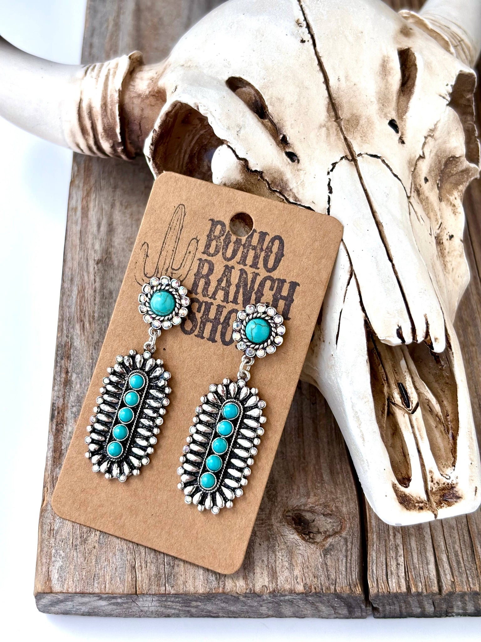 Western Style Statement with Stone Post Drop Earrings Size: 2"L Post Back Brushed Silver, Turquoise Stone, Glass Stone, Enamel Color Lead Compliant