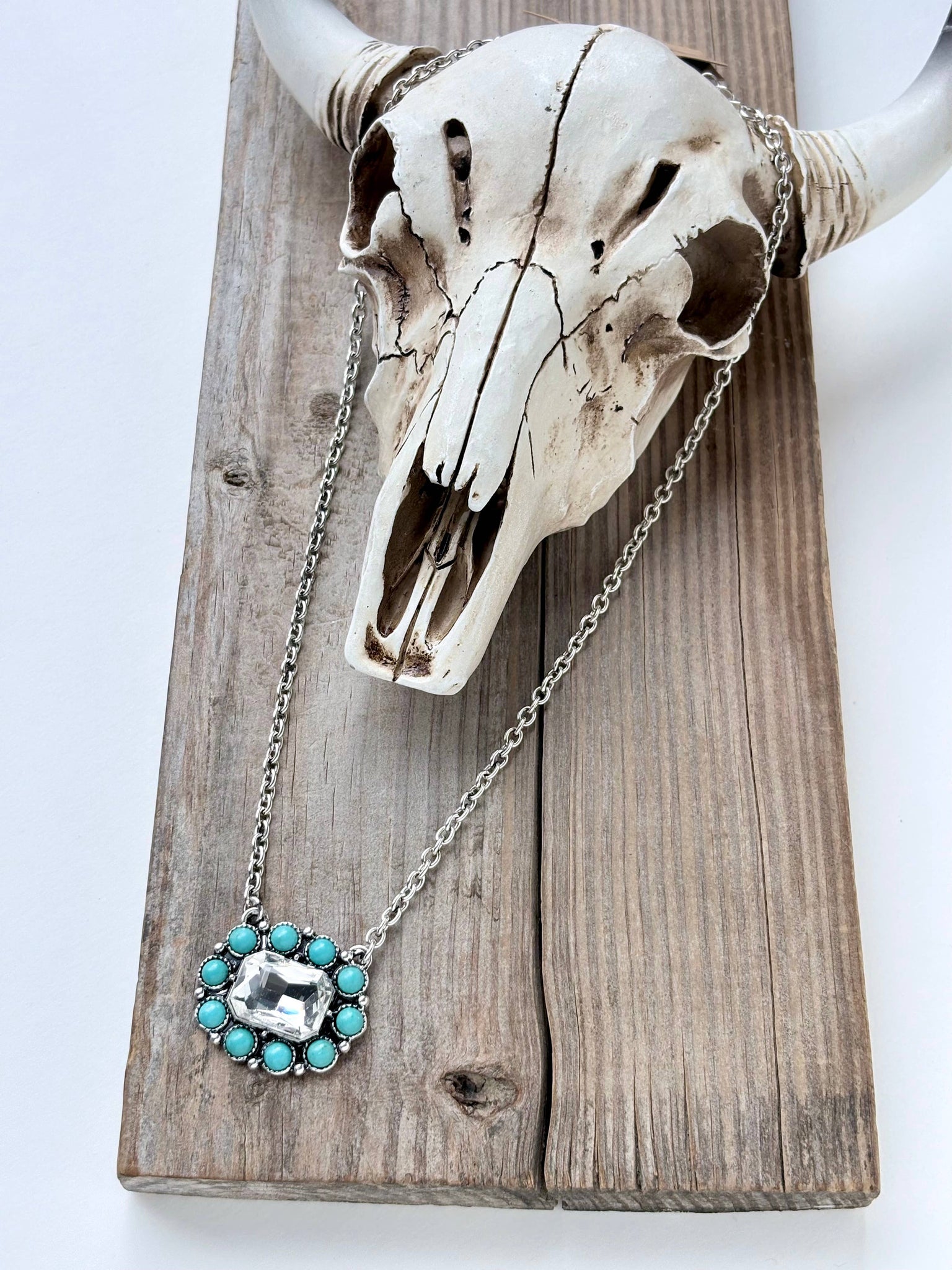 Western Style Rhinestone Concho w/ Turquoise Stone Pendant Link Chain Necklace